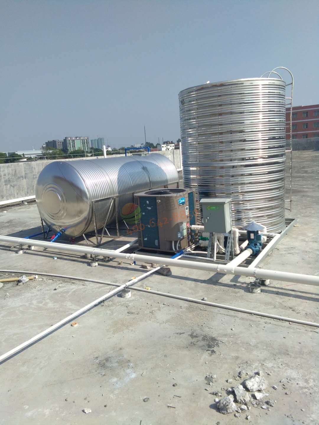 RSJ-200/MS-540V1(5P)美的空氣能熱泵主機(jī)1臺(tái)、5噸圓形立式不銹鋼保溫水箱1個(gè)臺(tái)及相關(guān)配套設(shè)施