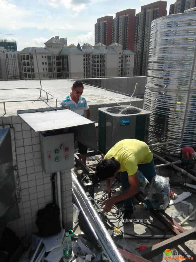 東莞市東江水務(wù)有限公司250人10匹10噸美的空氣能熱泵熱水工程安裝現(xiàn)場